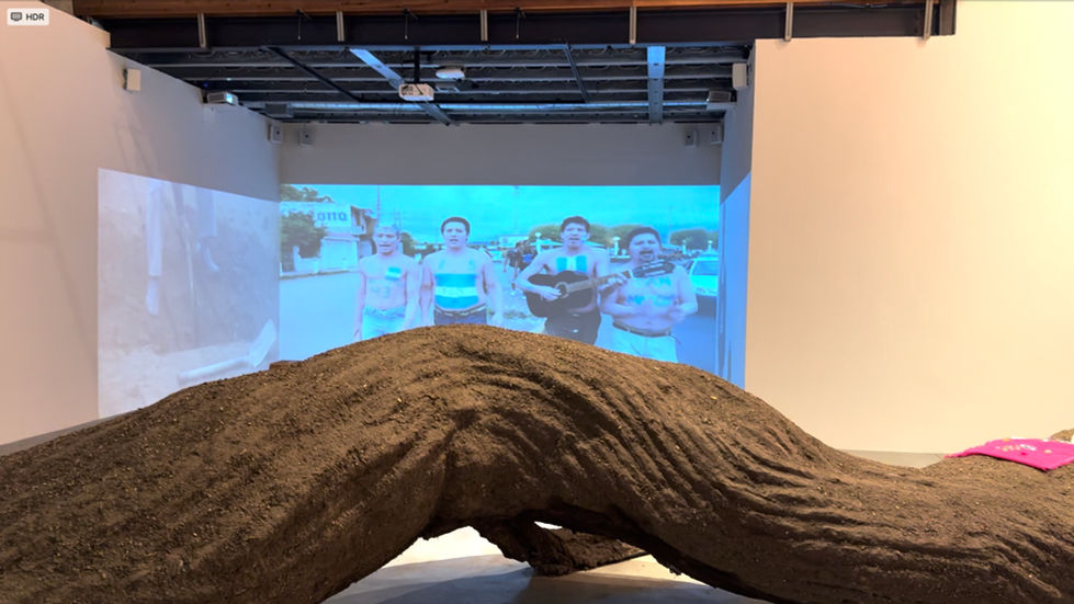 Given its surreal manifestation indoors, the tree appears like an unexpected dream. What to make of its twelve-meter length and the openings at either end—one at its root, smashed up against angled concrete slabs, and another branching into smaller limbs? At the exhibition’s opening performance, a woman occupied the hole nearest the branching end as if seated in a kayak. Her apparent merging with the tree embodied one idea insinuated by the work’s title, Universidad de la Tierra (University of the Earth, 2025): all living things connect through the land.