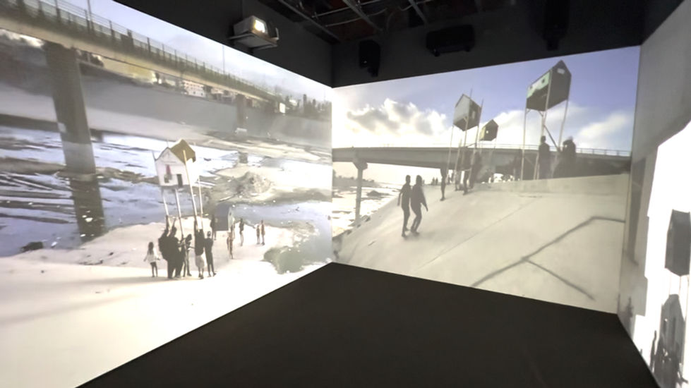 In a smaller theater constructed at the gallery’s rear, another set of videos plays simultaneously across three channels. In Chasing the Beast: Tijuana, Mexico (2021/2025), several individuals create models of homes they imagine living in, beyond their current bustling but resource-poor locale, which surrounds the viewer in the immersive setting. Carrying their creations in a casual street procession, they confront the border fence that prohibits them from pursuing their dreams, then set the models on fire.